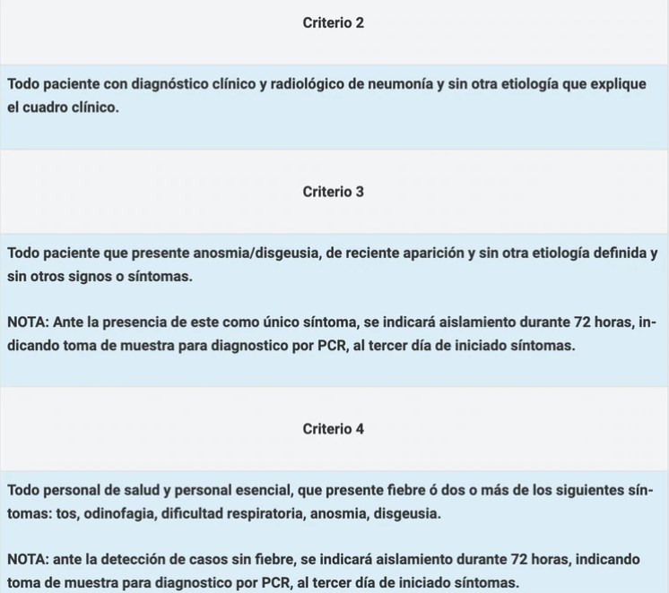 En total, Salud determinó cuatro criterios para definir su una persona debe ser testeada. El primero es para todo aquel que tenga tos, dolor de garganta, dificultad para respirar y pérdida de olfato y gusto. El segundo criterio contempla a “todo paciente con diagnóstico clínico y radiológico de neumonía y sin otra etiología que explique el cuadro clínico”. El tercero abarca a los pacientes con pérdida del olfato y gusto. El cuarto es para el personal de la salud: si presentan fiebre o al menos dos de los demás síntomas serán testeados.