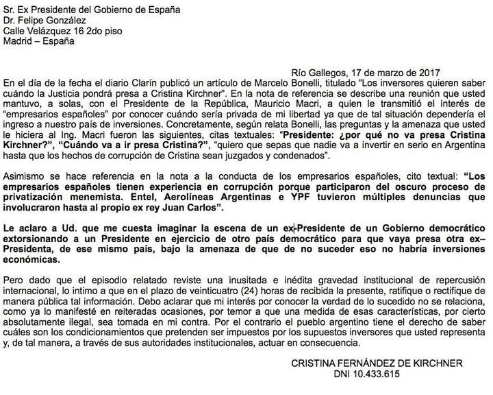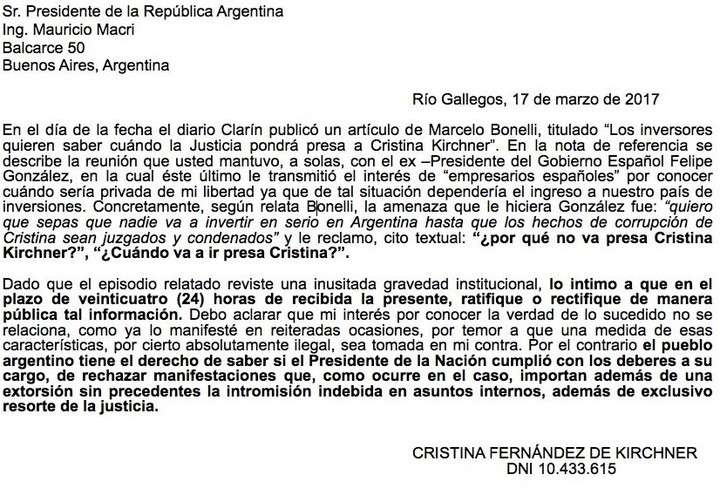 Cristina Kirchner informó hoy que le envió cartas documento al presidente Mauricio Macri y al expresidente español Felipe Gónzalez para que "ratifiquen o rectifiquen" la información publicada hoy en el "Panorama empresarial" de Marcelo Bonelli en Clarín, cuyo título dice que "los inversores quieren saber cuándo la Justicia pondrá presa" a la exmandataria.