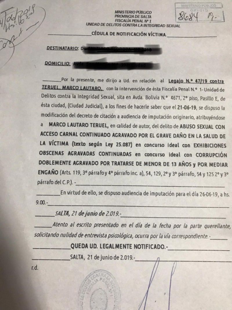 Este martes 25 de junio el fiscal Sergio Federico Obeid decidió ampliar la acusación contra Lautaro Teruel, hijo del Nochero Mario Teruel, detenido por violación. Será notificado este miércoles 26 a las 9:00 en una audiencia que tendrá lugar en la Fiscalía Penal 1 de la Unidad de Delitos contra la Integridad Sexual.