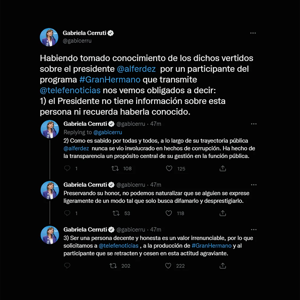 “Habiendo tomado conocimiento de los dichos vertidos sobre el presidente Alberto Fernández por un participante del programa Gran Hermano que transmite Telefé nos vemos obligados a decir: 1) el Presidente no tiene información sobre esta persona ni recuerda haberla conocido”, comenzó a enumerar Cerruti en su cuenta de Twitter.