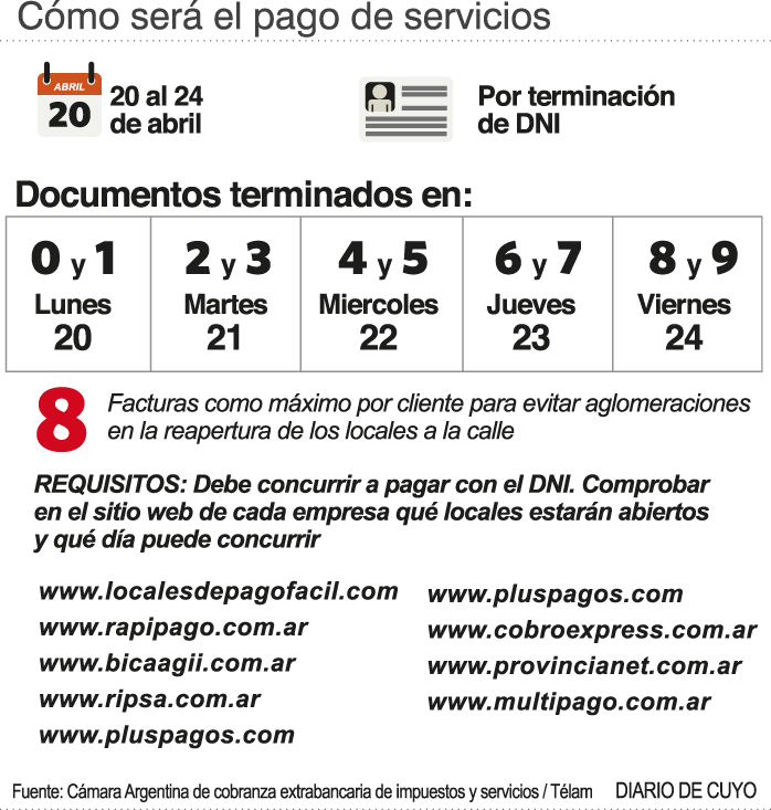 La Caeceis también adelantó que habrá un límite de facturas aceptadas por lo que cada cliente podrá abonar un máximo de 8 servicios o impuestos, en tanto que los adultos mayores y las personas pertenecientes a grupos de riesgo tendrán atención prioritaria y, en la medida de disponibilidad de cada local, se habilitarán horarios especiales para ellos.