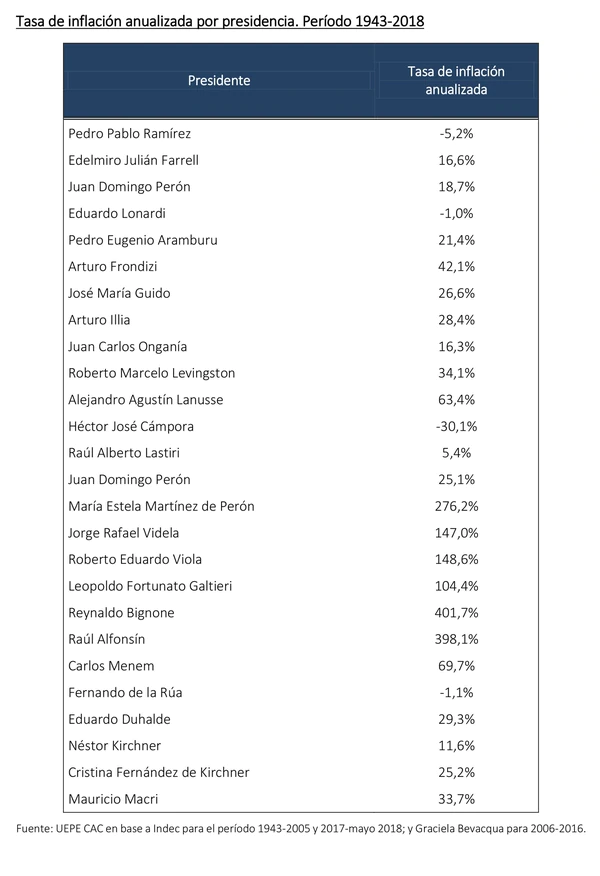 Desde el primer dato oficial de precios al consumidor en enero de 1943 hasta la muerte de Perón, en julio de 1974, fueron 14 los presidentes argentinos (constitucionales y de facto). La mayor variación interanual de precios durante este período se registró a mediados de 1959 bajo la presidencia de Arturo Frondizi, con una tasa de inflación que superó el 120%. Sin embargo, el presidente que experimentó una mayor tasa de inflación promedio durante su período de gobierno fue el presidente de facto Alejandro Lanusse, con un 63,4% de inflación anualizada en sus poco más de dos años en el poder, de acuerdo al relevamiento de la CAC.