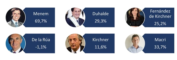 Sin embargo, la inflación promedio durante la presidencia de Carlos Menem fue significativamente elevada (69,7% anual), como consecuencia de la variación de precios registrada durante los primeros años de su gobierno. Con todo, el informe advierte que la inflación fue alta en su primer mandato (147,5% anual) y nula en el segundo (0% anual).