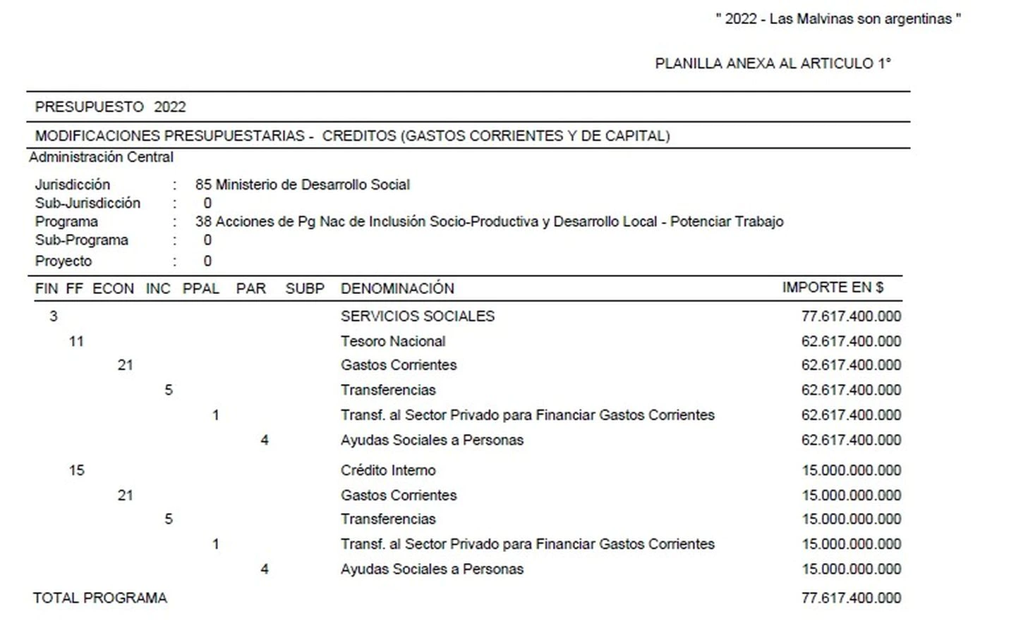 El Ejecutivo asignó otros $77.617.400.000 al Potenciar Trabajo, de acuerdo al Decreto de Necesidad y Urgencia (DNU) 331/2022 de adecuación presupuestaria publicado el 16 de junio en el Boletín Oficial, que se suman a los más de $227 mil millones del plan.