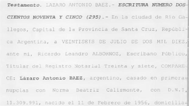 El documento fue suscripto el 26 de julio de 2010, fecha en la la cual Lázaro Báez prestaba sus servicios empresariales al Estado con alta frecuencia. Al momento de firmar su testamento, el autodenominado amigo de Néstor Kirchner tenía 56 años.