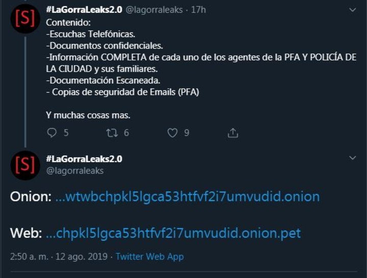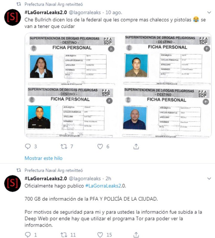 Fue la cuenta @lagorraleaks, que ya en 2017 informó haber vulnerado correos del Ministerio de Seguridad, la que se adjudicó el hackeo de la cuenta de Twitter de la Prefectura e informó también haber filtrado una serie de datos reservados de la Policía Federal y de la Policía de la Ciudad.
