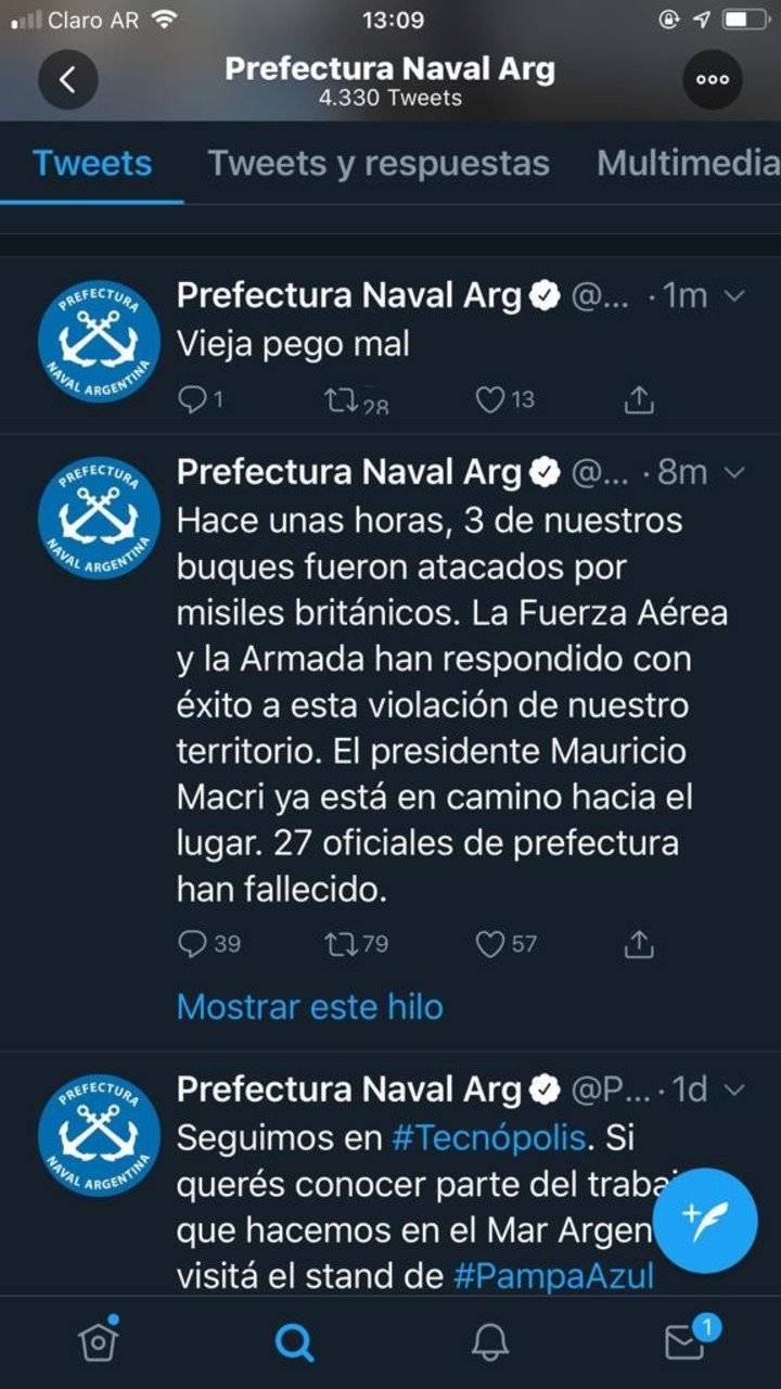 "Hace unas horas, 3 de nuestros buques fueron atacados por misiles británicos. La Fuerza Aérea y la Armada han respondido con éxito a esta violación de nuestro territorio. El presidente Mauricio Macri ya está en camino hacia el lugar. 27 oficiales de prefectura han fallecido", indicaba otro tuit más preocupante pero que es falso.
