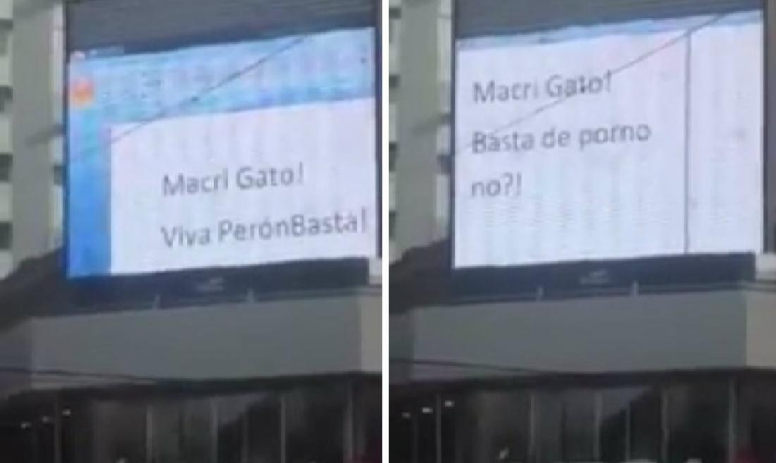 Una pantalla gigante con publicidad ubicada en pleno Belgrano, en Buenos Aires, sorprendió de golpe a quienes recorrían el lugar cuando comenzó a mostrar una película pornográfica. Luego, y delante de un fondo blanco, apareció la leyenda "Macri gato". Y un instante después "Viva Perón". Hasta que el cartel quedó en negro.