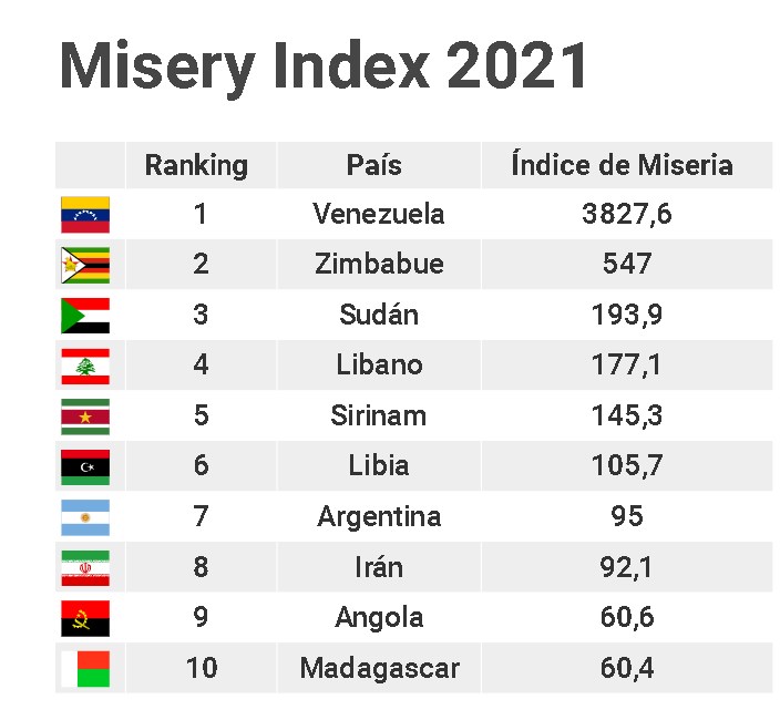 En el ranking de Miseria 2020 al podio que encabeza Venezuela lo completan Zimbabwe, con 547 puntos (desempleo 4,9%, inflación 495%, tasa activa 35% anual y caída del PBI por habitante del 12,1%) y Sudán, con 193,9 puntos (desempleo del 25%, inflación del 141,6, tasa activa del 16,6% y 10,7% de caída del PBI por habitante en 2020).