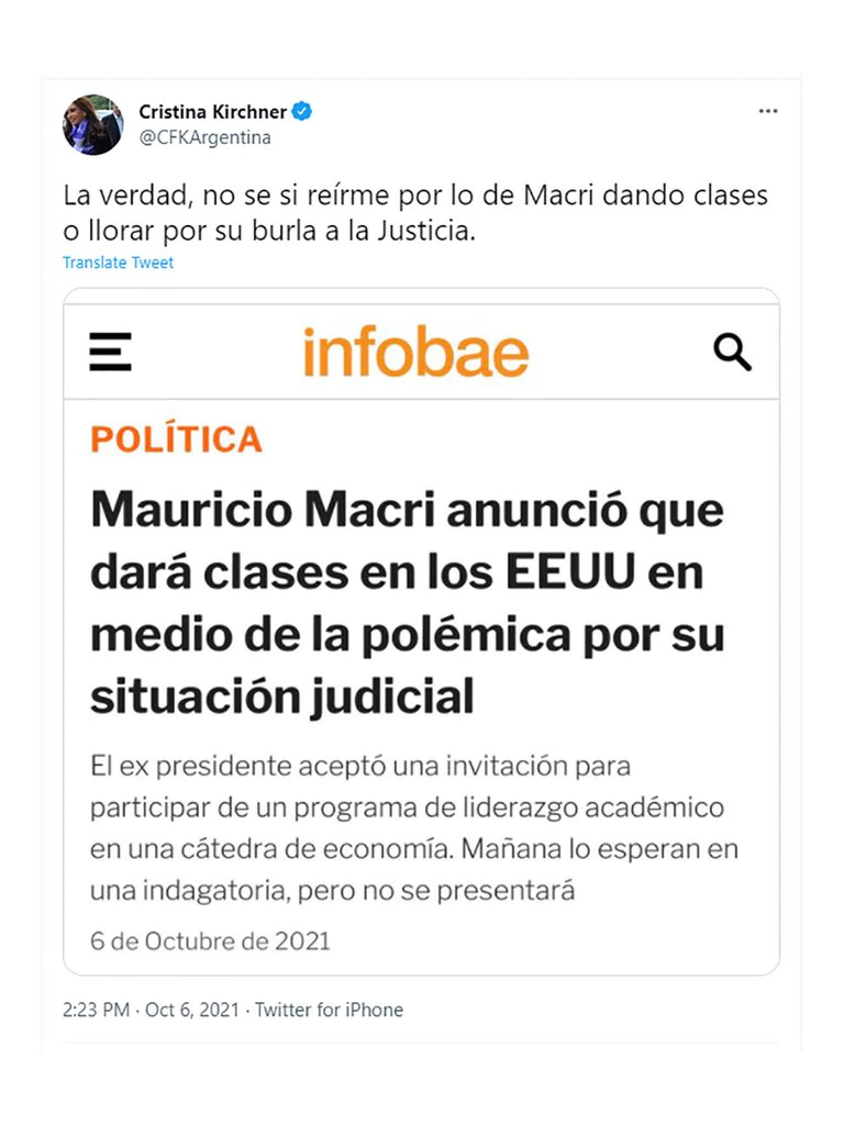 En ese contexto y minutos antes de ingresar para encabezar la sesión que se lleva a cabo en el Senado, Cristina Kirchner opinó sobre el ex mandatario a través de su cuenta oficial de Twitter: “La verdad, no sé si reírme por lo de Macri dando clases o llorar por su burla a la Justicia”.