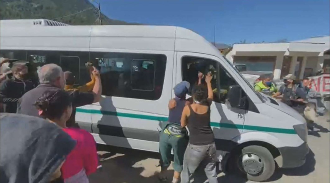 Al finalizar la reunión, un grupo de manifestantes increpó a la comitiva y comenzó a arrojar piedras y a golpear a la camioneta. Al parecer, reclamaban al gobernador y al presidente por la actividad minera en la provincia, puntualmente por un proyecto que Arcioni apunta a ampliar pero que los pobladores rechazan debido a las consecuencias ambientales.