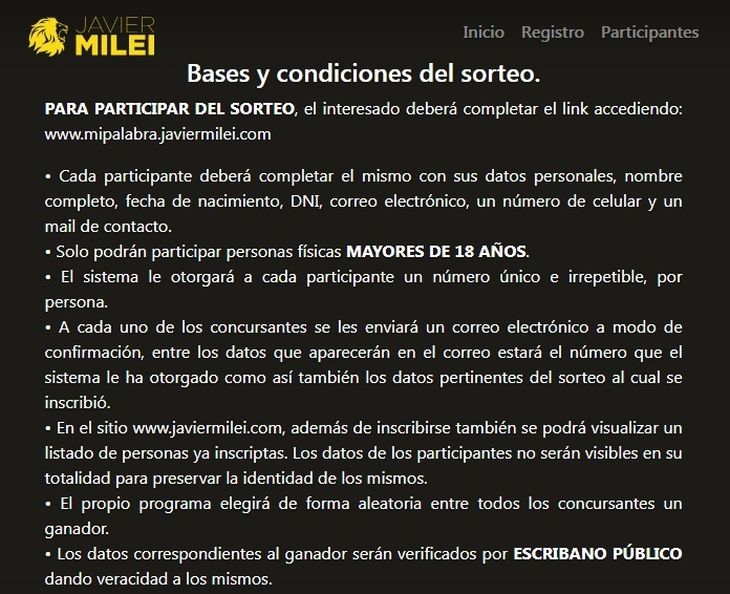 “El número válido para el sorteo será el orden en el que el participante se haya inscripto en el formulario. Milei hará todo el proceso ante la presencia de cámaras en vivo y un escribano para garantizar la credibilidad del proceso”, sostuvieron.