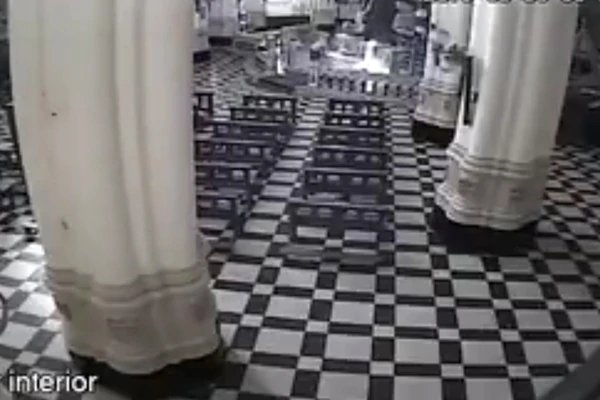 En las imágenes de seguridad puede verse como este hombre de mediana de edad toma una de las velas que yacían en el candelabro y quema una pieza de tela que se encontraba sobre el sagrario de la iglesia.