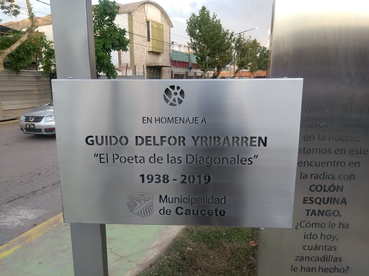 Bueno, en ese momento, me comuniqué con Miriam y nos pusimos manos a la obra. Mirian se contactó con Delfor, hijo de Guido, y luego concretamos una reunión donde nos entregó la documentación que necesitábamos para fundamentar las gestiones pertinentes. Miriam lo fue coordinando con el área de Cultura de la Municipalidad de Caucete hasta que la idea llega a la Intendenta Romina Rosas quien toma un gran interés por el tema. Esto nos permite brindarle nuestra gratitud por hacer posible la concreción de la placa en homenaje a Guido Iribarren en la Diagonal de Caucete cuyo denominación artística definía a Guido Iribarren como "El poeta de las diagonales".