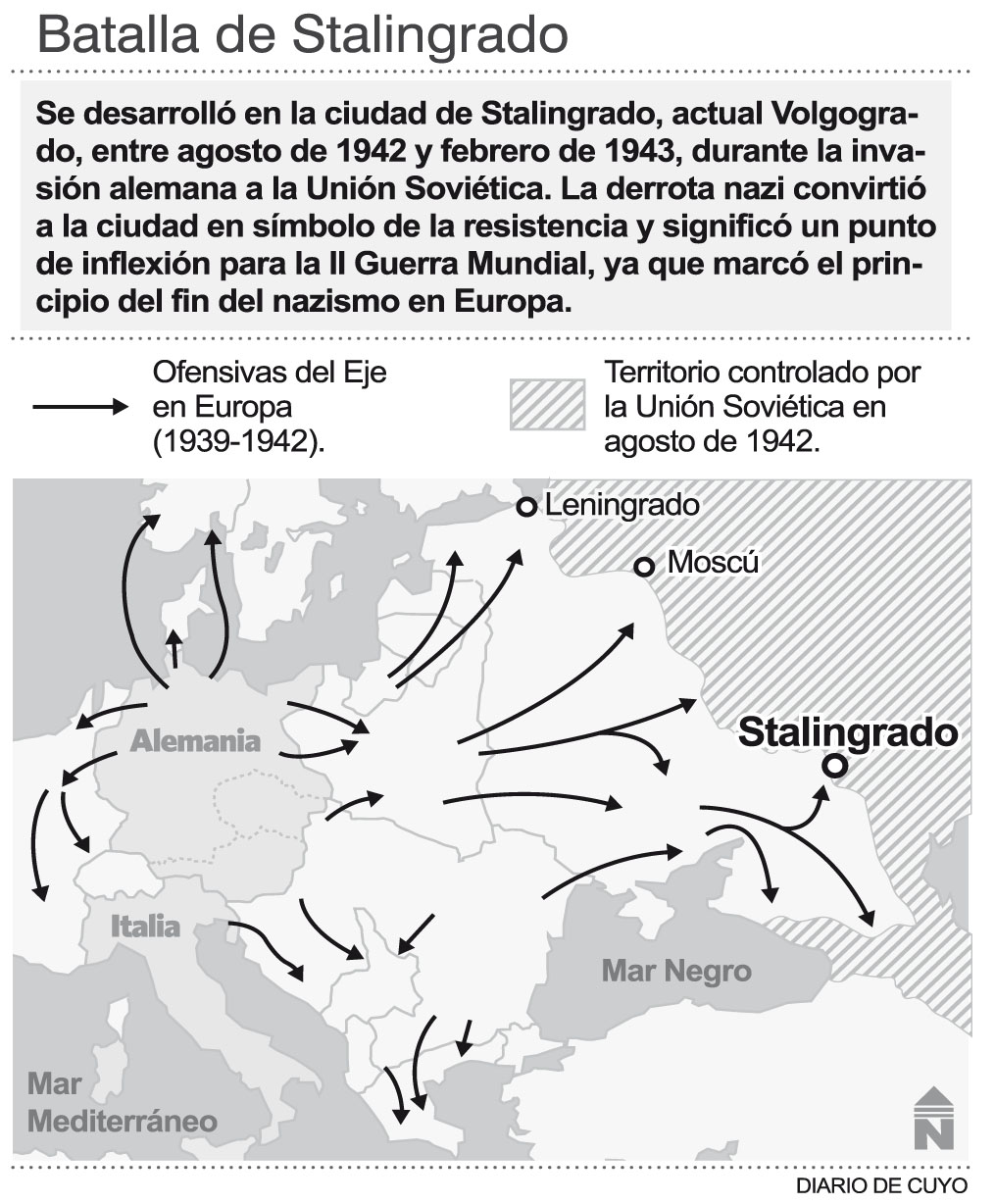 El 2 de febrero de 1943 finalizó la batalla de Stalingrado. Triunfo de la Unión Soviética sobre la Alemania nazi y sus aliados. Fue la lucha más sangrienta de la historia, que había comenzado en agosto de 1942. Fue el punto de inflexión durante la Segunda Guerra Mundial para los alemanes, hasta su total derrota en 1945.