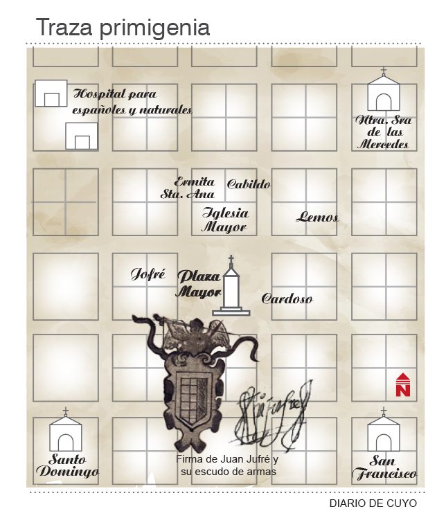 En el acto de fundación de San Juan de la Frontera, se realizó el "repartimiento fundador" por el cual se asignaron solares frente a la Plaza para la Iglesia Matriz, el Cabildo y la Ermita de Santa Ana. Los cuatro solares externos del ejido se destinaron a los Conventos e Iglesias de Santo Domingo, San Francisco y la Merced y los hospitales para españoles y naturales. En la parte superior se sitúa el escudo real de Castilla y en la parte inferior la rúbrica de Juan Jufré.