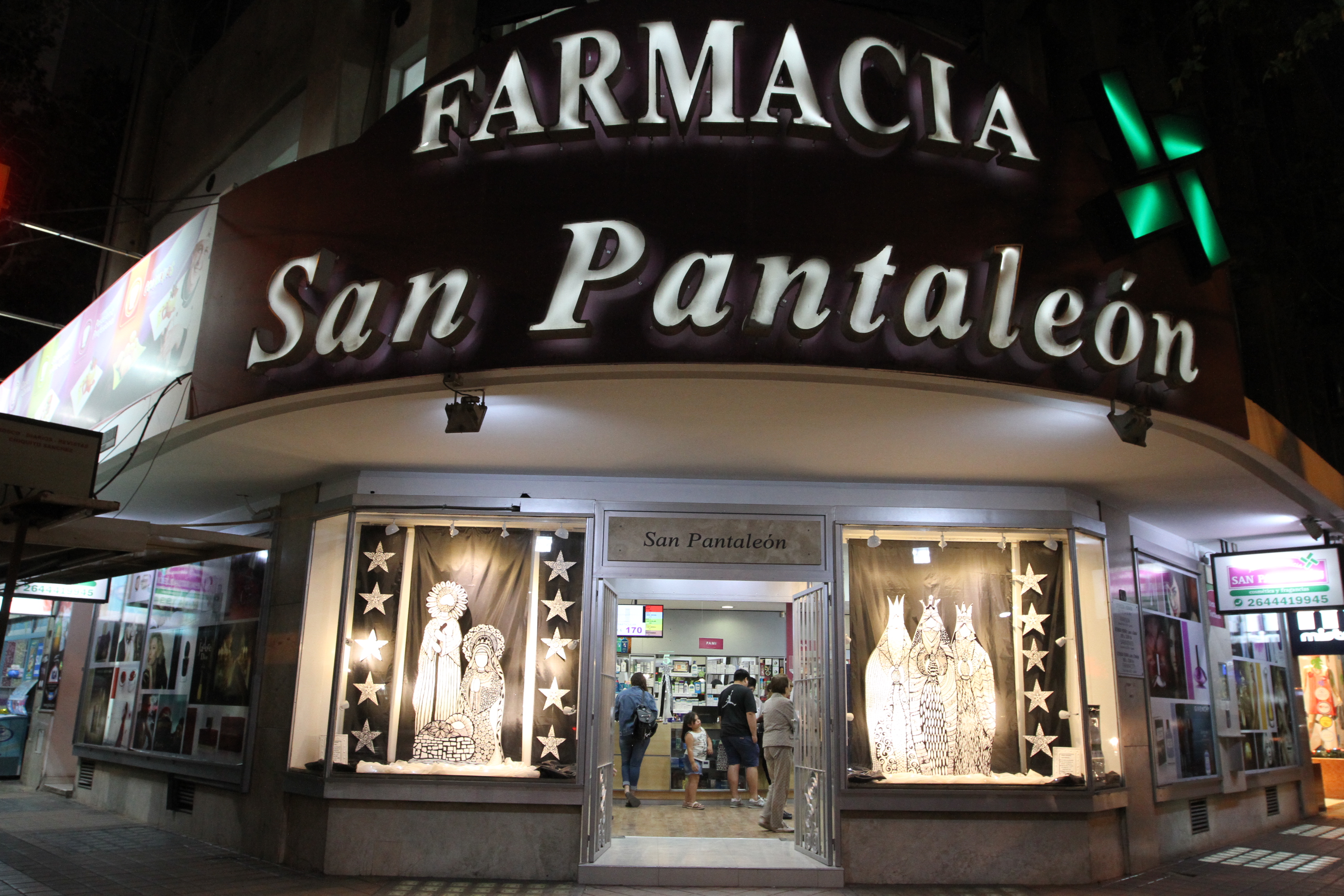Vidriera navideña. Como ya es tradicional para las fiestas de fin de año, Farmacia San Pantaleón se destaca por la ornamentación de sus vidrieras. Por este motivo ganó varios premios en un concurso sobre el tema.