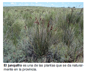 El junquillo es una planta herbácea, de tallo recto y flexible, que crece dentro del agua o en lugares húmedos, donde forma matas compactas. Con el tallo de junquillo siempre se fabricaron escobas, pero fue poco empleado para artesanías. Se da en distintos lugares de nuestra provincia, pero se observa en grandes cantidades en Médano de Oro, ya que crece en sitios donde hay humedales.