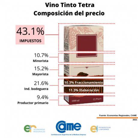 Un estudio elaborado por el sector de Economías Regionales de la Confederación Argentina de la Mediana Empresa (CAME) revela que los impuestos representan aproximadamente el 43% del precio que el consumidor abona en góndola por el vino tinto tetra y la botella gama media-baja de 750 centímetros cúbicos (cc). Por su parte, el viñatero -productor primario- sólo explica el 9.4% y el 5.8% del precio final, respectivamente.
