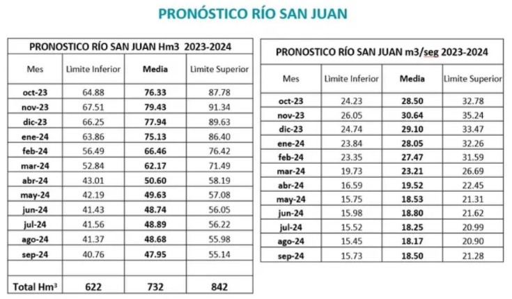 En rigor, se estima que el río San Juan derrame 732 Hm3, un volumen de agua muy escaso que lo ubica entre las peores 5 temporadas en los últimos 100 años. Otro dato que permite graficar el escenario, es que es menor también a la anterior, que entregó 1.010 Hm3. Esto ubica a la temporada que viene como "extremadamente seca".