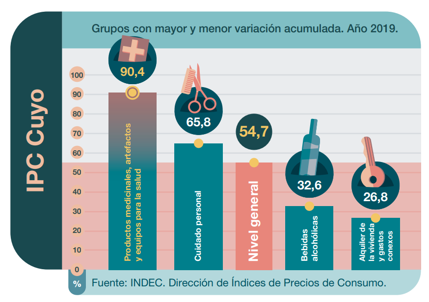 Del mismo modo, indicaron que en la región cuyana, los rubros que más aumentaron fueron: Salud (90,4%), elementos para el cuidado personal (65,8%), nivel general (54,7), bebidas alcohólicas (32,6%) y alquiler de vivienda y otros gastos (26,8%).