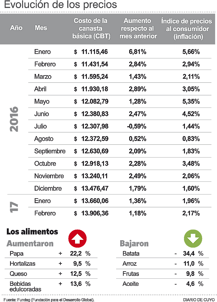 ‘’El aumento de febrero fue principalmente de servicios, porque la inflación núcleo, que son los alimentos; tuvo un aumento interanual del 0,9%, que se ve reflejado en la Canasta Básica Alimentaria. Pero en la canasta Básica Total, que incluye los servicios, el aumento supera el 2 por ciento’’, explicó el presidente de la consultora Fundeg, el economista Eduardo Coria Lahoz. Justamente con este incremento los sanjuaninos ahora precisan indefectiblemente casi 14.000 pesos para adquirir la canasta alimentaria total (ver aparte).