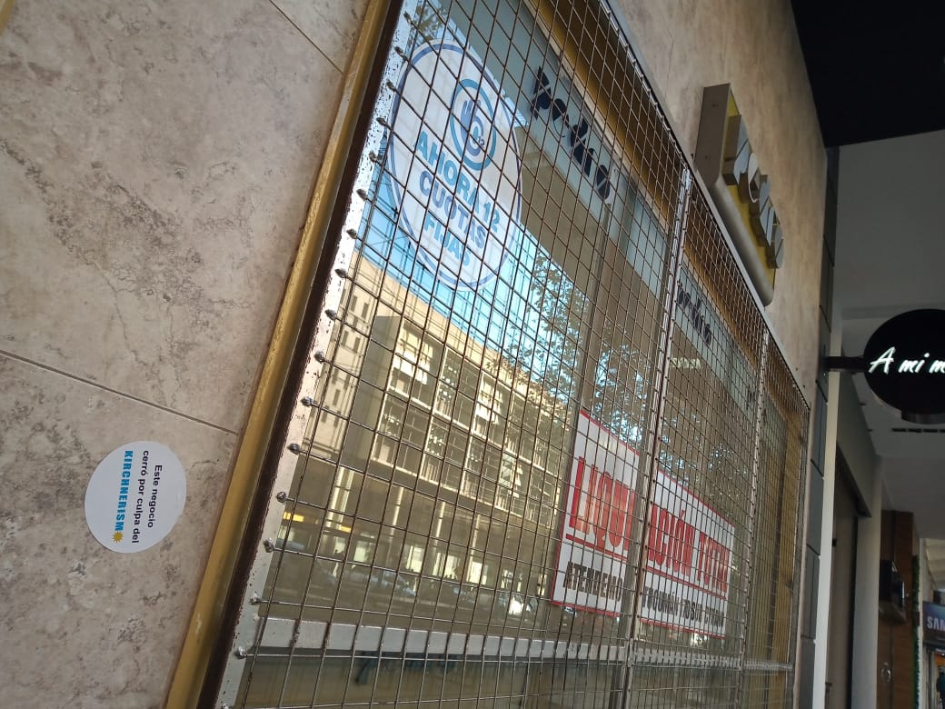 "Este negocio cerró por culpa del kirchnerismo", rezan las pegatinas que aparecieron durante las últimos días en locales céntricos de la provincia que, en varios casos, debieron bajar sus persianas por la crisis. Los stickers forman parte de una curiosa campaña, de autor anónimo y desconocido.