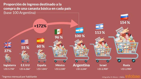 Con esos datos de precios e ingresos se pudo detectar que los argentinos deben trabajar casi el doble que una persona en los EEUU y en España, y casi el triple que en Inglaterra para poder adquirir una idéntica canasta de productos frescos: verduras, carne roja y blanca, lácteos, huevos y también envasados, como fideos, arroz, harina, azúcar, y bebidas cola, cerveza, y café. Prácticamente se equipara con la población mexicana, y, obtiene una moderada ventaja con los israelíes y más aún con los residentes en Rusia.