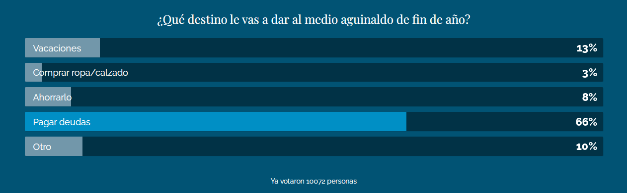 El dato surge de un sondeo realizado por DIARIO DE CUYO en el que se consultó: "¿Qué destino le vas a dar el medio aguinaldo de fin de año". Al respecto, el 66% de los 10.072 votantes eligieron la opción “pagar deudas”.