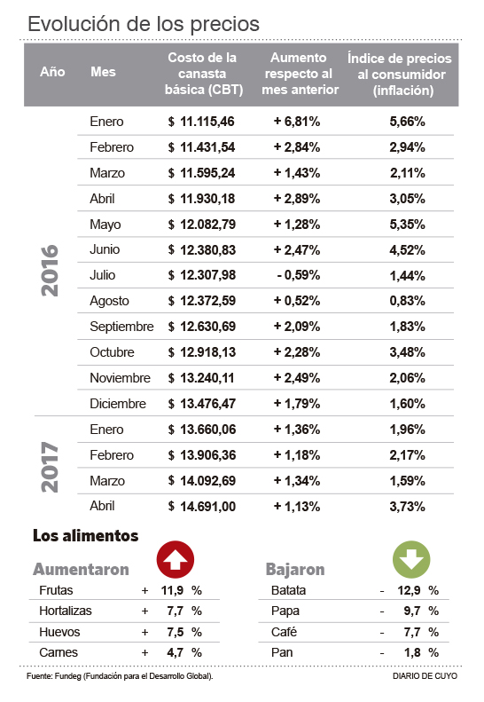 El mes pasado una familia sanjuanina necesitó ingresos por 14.691 pesos para cubrir una canasta básica de alimentos y servicios básicos (CBT) y no ser pobre, según los cálculos realizados por Fundeg.