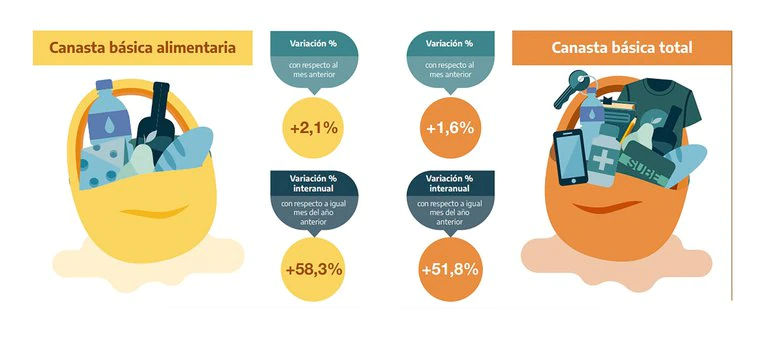 Por su parte, la canasta alimentaria avanzó ese mes un 2,1% y de esa manera determinó que una familia tipo precisó $29.003 para no ser considerada indigente. Este indicador está influido principalmente por la suba de los alimentos, que desde finales de 2020 registró una aceleración.