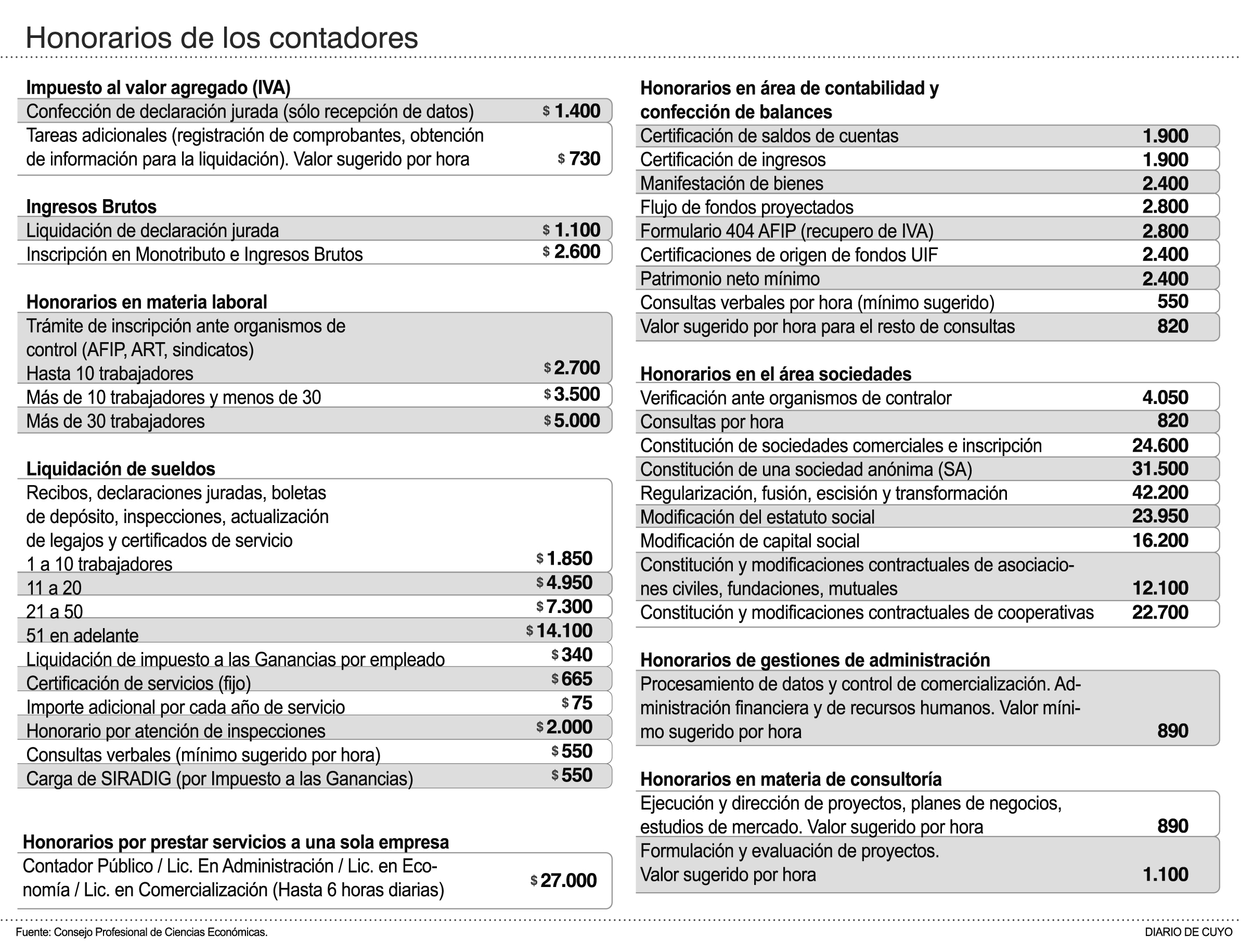 Cada hora de trabajo, según la complejidad de la tarea a realizar, como puede ser desde una consulta breve a operaciones complicadas, oscila entre los 550 a los 820 pesos, por ejemplo para asesorar a una empresa en materia de contabilidad o confección de balances. O pueden trepar a los 1.100 pesos cuando se trata de labores de consultoría para evaluación de proyectos o formulación de planes de negocios.
