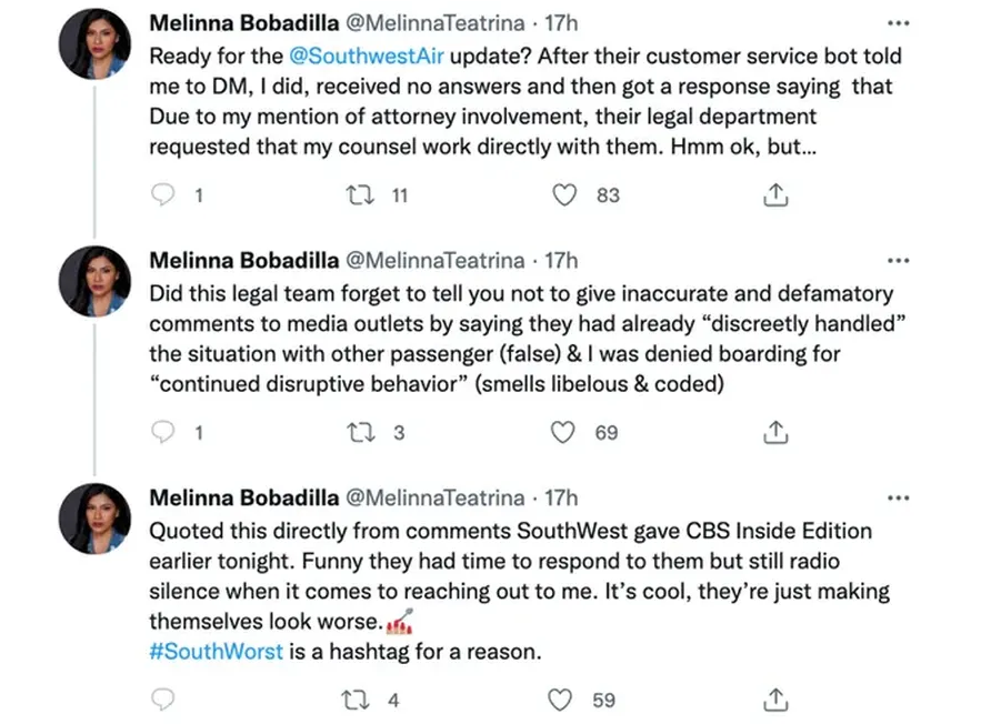 Melinna Bobadilla, actriz reconocida por su papel en la serie Orange is the New Black, denunció mediante Twitter que fue expulsada de un vuelo por defender a una mujer de color que presuntamente era acosada y humillada por el personal de la aerolínea con la que iba a viajar. La artista expresó lo disgustada que se sentía por haber sido tratada de esa manera, incluso por las autoridades.