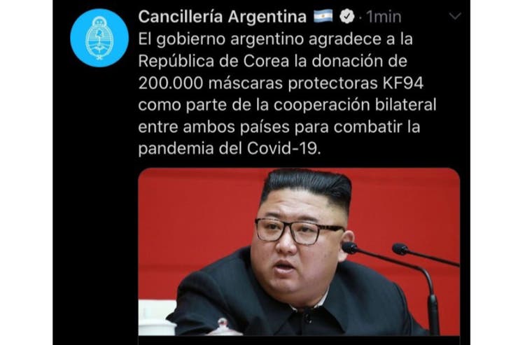 "El gobierno argentino agradece a la república de Corea la donación de 200.000 máscaras protectoras KF94 como parte de la cooperación bilateral entre ambos países para combatir la pandemia de Covid-19", escribieron en la cuenta e ilustraron el mensaje con una fotografía del norcoreano, con su traje característico negro y anteojos, en vez de utilizar una del presidente surcoreano, Moon Jae-in.