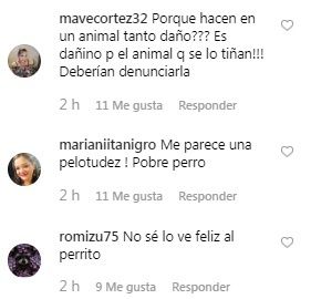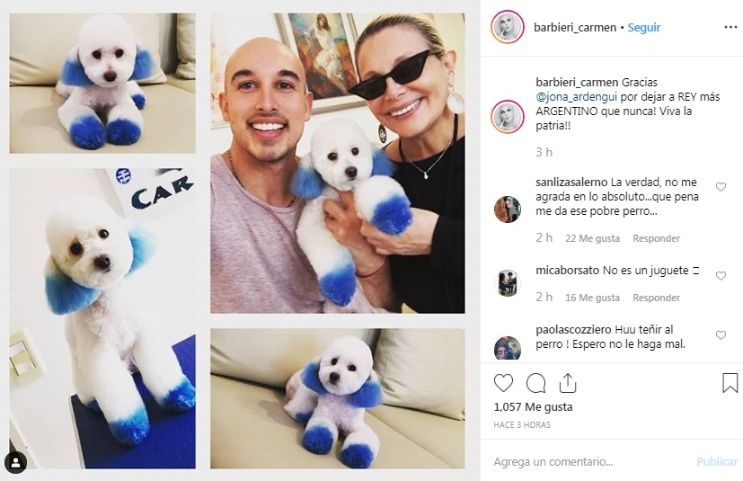 Lejos de causar ternura con su posteo, Carmen fue repudiada y acusada de maltrato animal. "La verdad no me agrada en lo absoluto, qué pena me da ese pobre perro", "No es un juguete", "Espero no le haga mal", "¿Por qué le hacen tanto daño a un animal? ¡¡Es dañino para el animal que lo tiñan!! Deberían denunciarla", "No se lo ve feliz al perrito", "¿Con qué necesidad pintar así un animalito? Mal ahí ", fueron algunos de los comentarios de los usuarios, indignados con Barbieri.