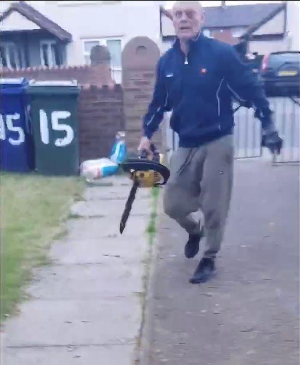 Jess Appleby, de 28 años, compartió en Facebook el video en el que se puede ver a su vecino, Stewart Palmer, sierra en mano y enfilando hacia su cocina, informó el sitio británico Mirror.