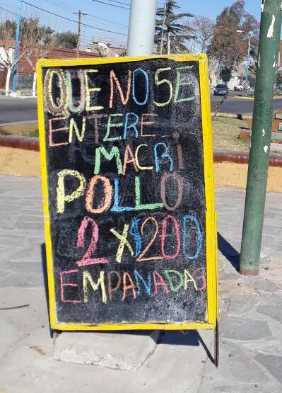 Un comerciante rawsino que vende pollos y empanadas sorprendió con un cartel que colocó en su puesto de venta, ubicado en Calle 5 y Mendoza.