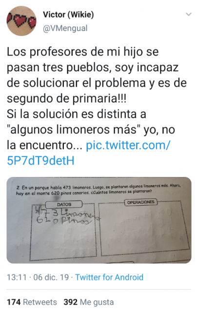 Todo comenzó el 6 de diciembre cuando @ Vmengual escribió “Los profesores de mi hijo se pasan tres pueblos, soy incapaz de solucionar el problema matemático y es de segundo de primaria. Si la solución es distinta a ‘algunos limoneros más’, yo no la encuentro”. En la foto que adjuntó se lee el siguiente problema: “En un parque había 473 limoneros. Luego se plantaron algunos limoneros más. Ahora hay en el monte 620 pinos canarios. ¿Cuántos limoneros se plantaron?”.