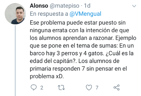 En tanto que una usuaria planteó que quizás el ejercicio no era de matemáticas sino de lógica: “No parece que se trate de un problema de matemáticas. Así que los números están para “despistar”. Hay que prestar atención al texto. Es un problema de comprensión lectora. Pero tienes mucha razón, es complejo para segundo de primaria”. En la misma dirección fue otro hombre: “Ese problema puede estar puesto sin ninguna errata con la intención de que los alumnos aprendan a razonar. Por ejemplo, ‘En un barco hay 3 perros y 4 gatos. ¿Cuál es la edad del capitán? Los alumnos de primaria responden 7 sin pensar en el problema’”.