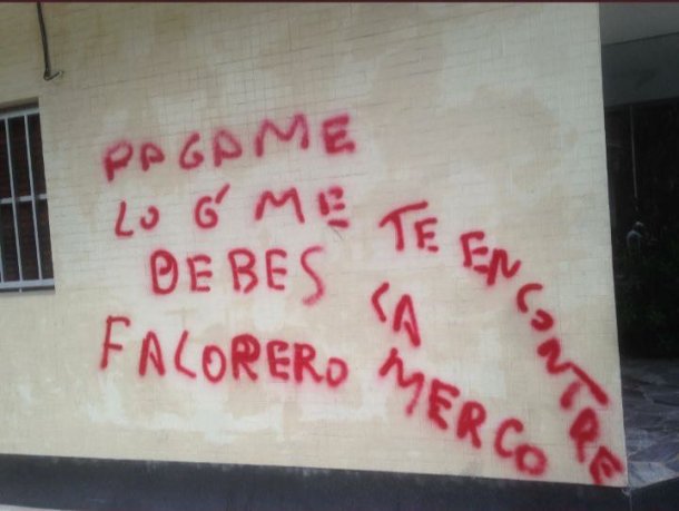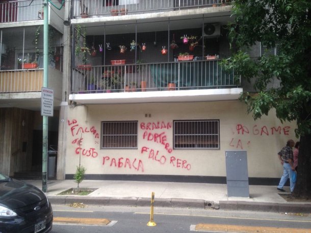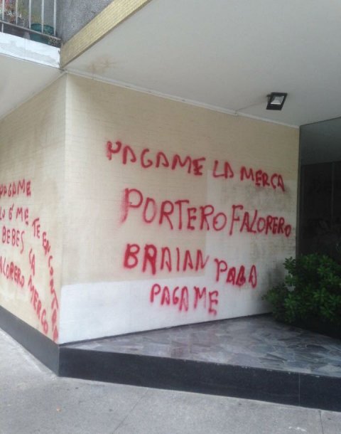 “Pagame la merca, portero falopero”, se lee al lado de la puerta de entrada, escrito con un areasol color rojo.
