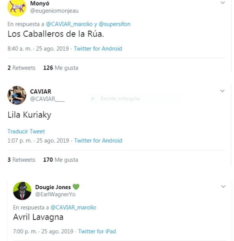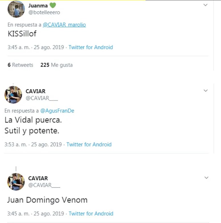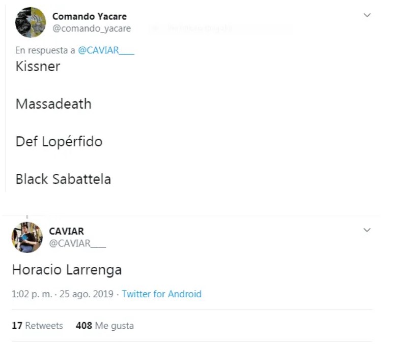 La iniciativa comenzada por "CAVIAR" fue replicada por otros cientos de twitteros que continuaron ideando otras llamativas y graciosas combinaciones: Juan Domingo Venom, Horacio Larrenga, Avril Lavagna, fueron algunos de las invenciones que cobraron mayor relevancia en las redes.