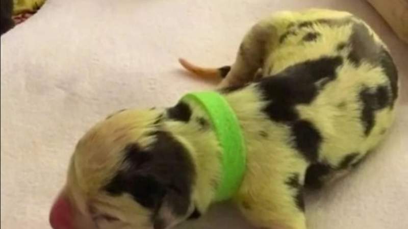 Al principio, Caddy Willians, la dueña de la perra, pensó que el octavo cachorro tenía pelaje negro pero grande fue la sorpresa cuando lo llevó al veterinario y le confirmaron que era verde.