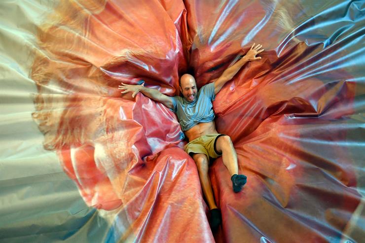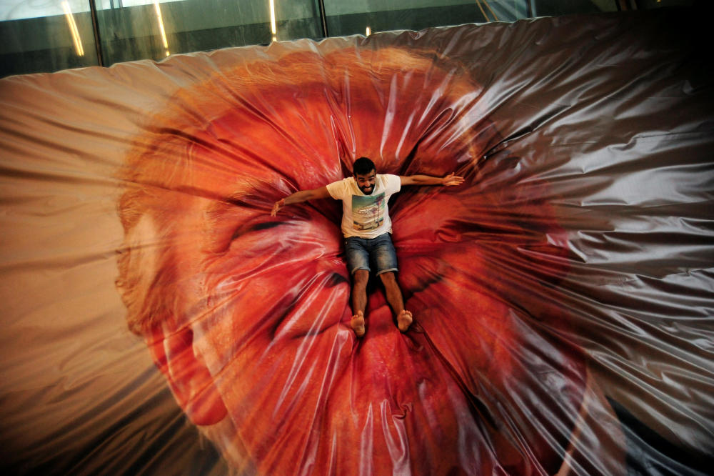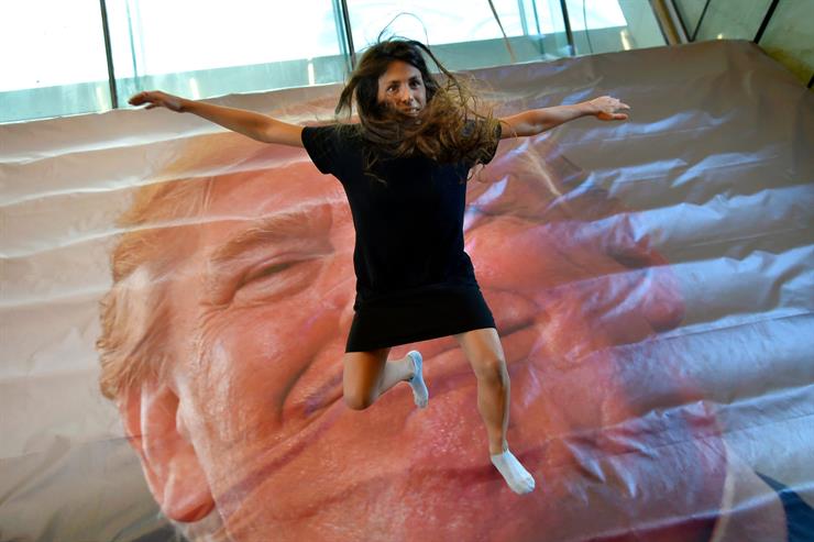 Erik Kessels y Thomas Mailaender presentaron en el Festival de la Imagen Getxophoto, en Guecho (Vizcaya), su instalación "Jump Trump", que permite saltar sobre una colchoneta gigante con la cara impresa de Donald Trump.