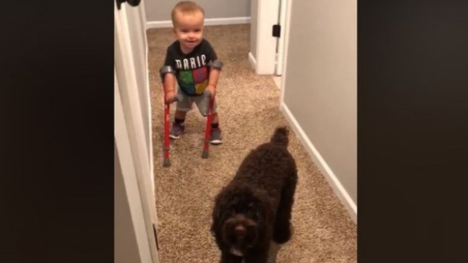 Román Dinkel es un pequeño de Estados Unidos que nació con la deficiencia llamada "Espina Bífida" y da sus primeros pasos apoyado en unas muletas y siguiendo a su mascota Maggie dentro de su casa. La grabación se volvió viral entre los usuarios de la red social.