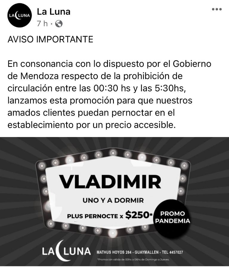 El Gobierno de Mendoza decidió adherirse a la restricción de circulación entre las 00:30 y las 5:30, lo cual motivo que uno de los hoteles alojamiento más conocidos de la provincia ofreciera una creativa promoción. Se trata de la ‘Promo Vladimir: uno y a dormir’.