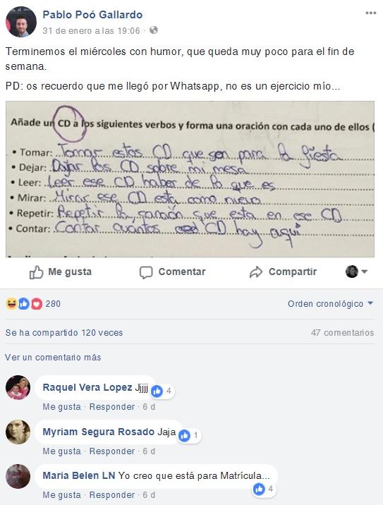 El profesor de secundario Pablo Poó Gallardo compartió en su cuenta de Facebook el ejercicio de un alumno y generó furor en la red social. La consigna ¿era clara?: “Añade un CD -complemento directo- a los siguientes verbos y forma una oración con cada uno de ellos”, decía el enunciado.