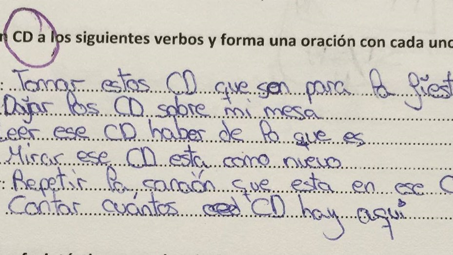 La respuesta del alumno fue bastante “lógica”: en lugar de añadir un complemento directo -lo que en Argentina sería el objeto directo- el chico añadió la palabra CD (compact disc) e hizo una oración con cada uno de los verbos.