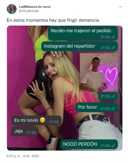 “En estos momentos hay que fingir demencia”, escribió la usuaria junto a la captura de pantalla donde se puede ver que la joven escribe: “Recién me trajeron el pedido. Instagram del repartidor, por favor”, junto a un sticker de Cristiano Ronaldo, en donde se lo ve dibujando un corazón en el aire.