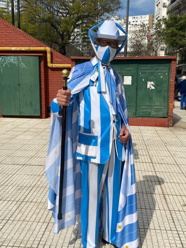 El sastre de 80 años, Jorge Williams, no podía faltar en la jornada electoral. Sus fotos inundaron las redes sociales. Luce un traje con los colores patrios y una bandera de Argentina como capa. Es un creador con 69 años en el oficio y presume ser “el último sastre”. Esta vez le agregó a su outfit un barbijo a tono para ir a votar a un colegio del barrio de Palermo.