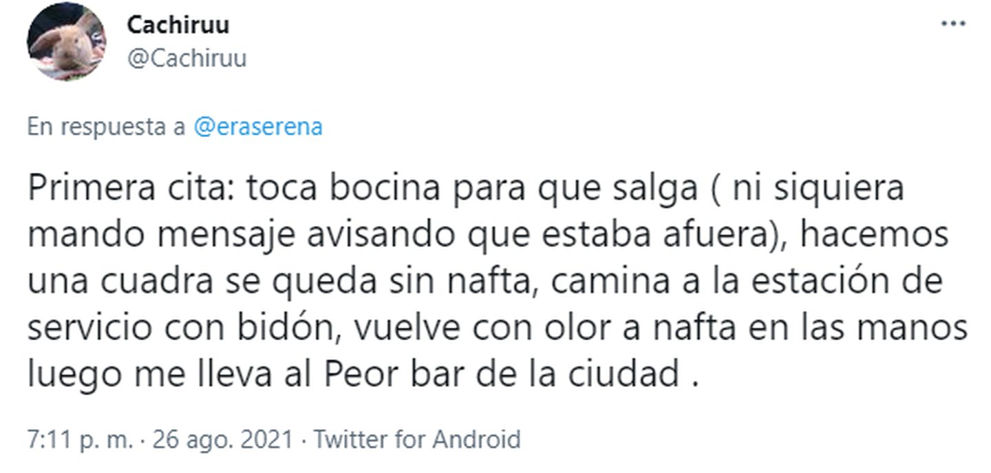 A su vez, la usuaria @Cachiruu también reveló una de sus extravagantes primeras citas: “Primera cita: toca bocina para que salga (ni siquiera mandó mensaje avisando que estaba afuera), hacemos una cuadra se queda sin nafta, camina a la estación de servicio con bidón, vuelve con olor a nafta en las manos luego me lleva al peor bar de la ciudad”.